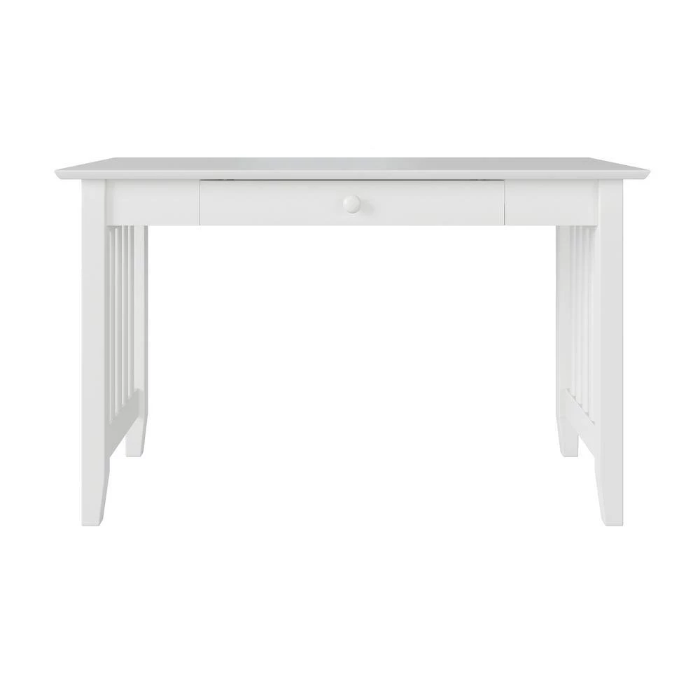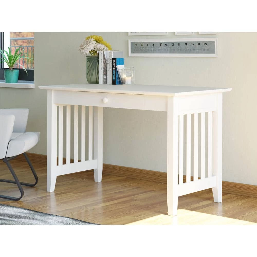 Ample study space and a drawer to store supplies are the hallmarks of our time-tested and inspired Mission Desk. Slatted side panels makes this design fresh, simple, and stylish. As durable as they are chic, this desk is manufactured using sustainably sourced solid hardwood. The perfect addition to any home office or study space, this desk offers a large work area that comfortably accommodates a laptop or desktop, along with a spacious storage drawer for all of your other work essentials.