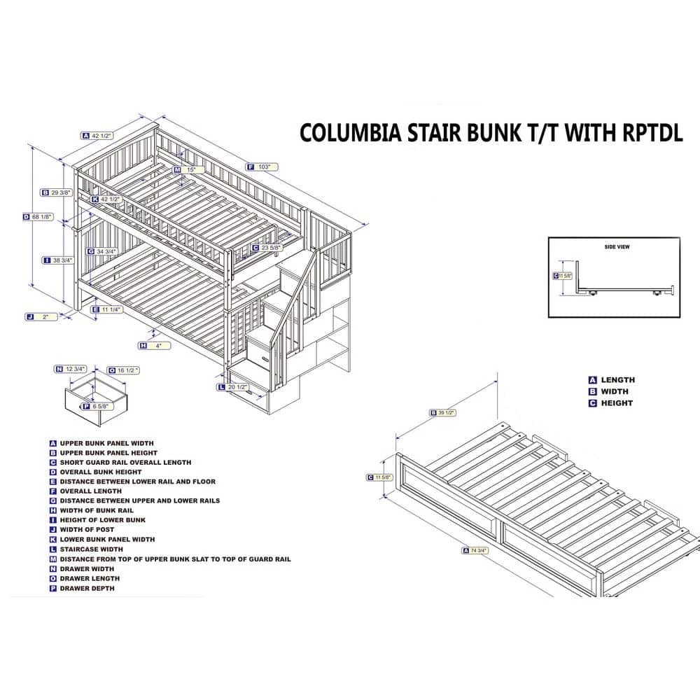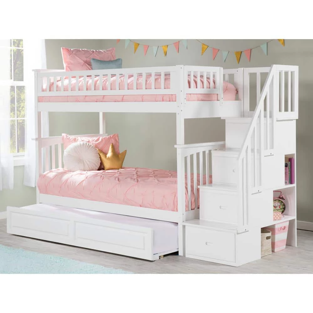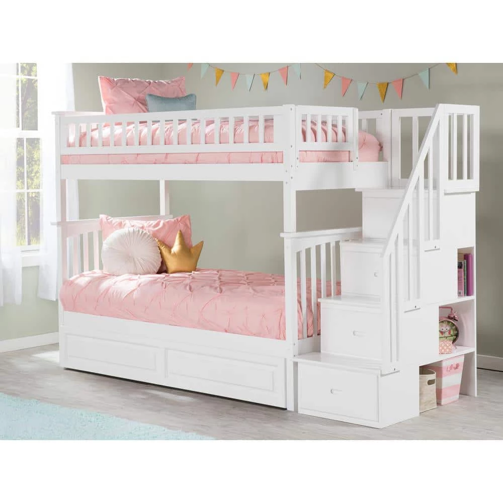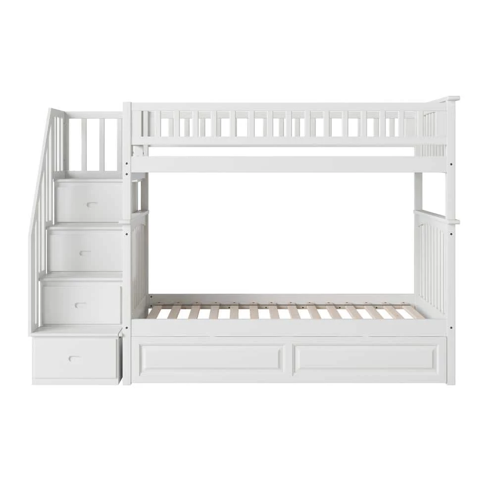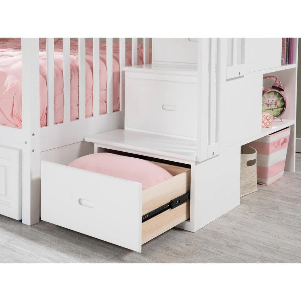 - Includes assembled staircase, Staircase can be set up at either end of the bunk bed