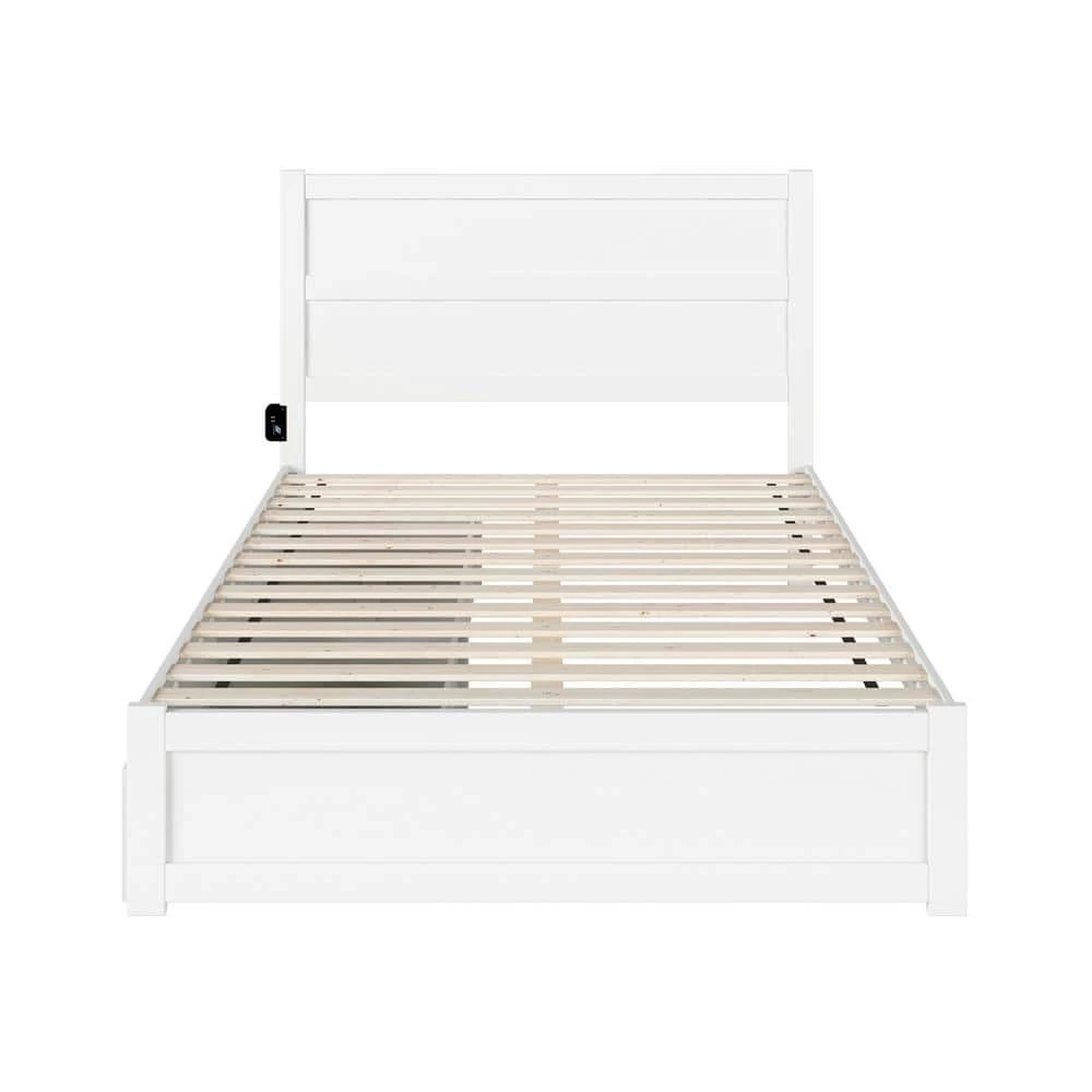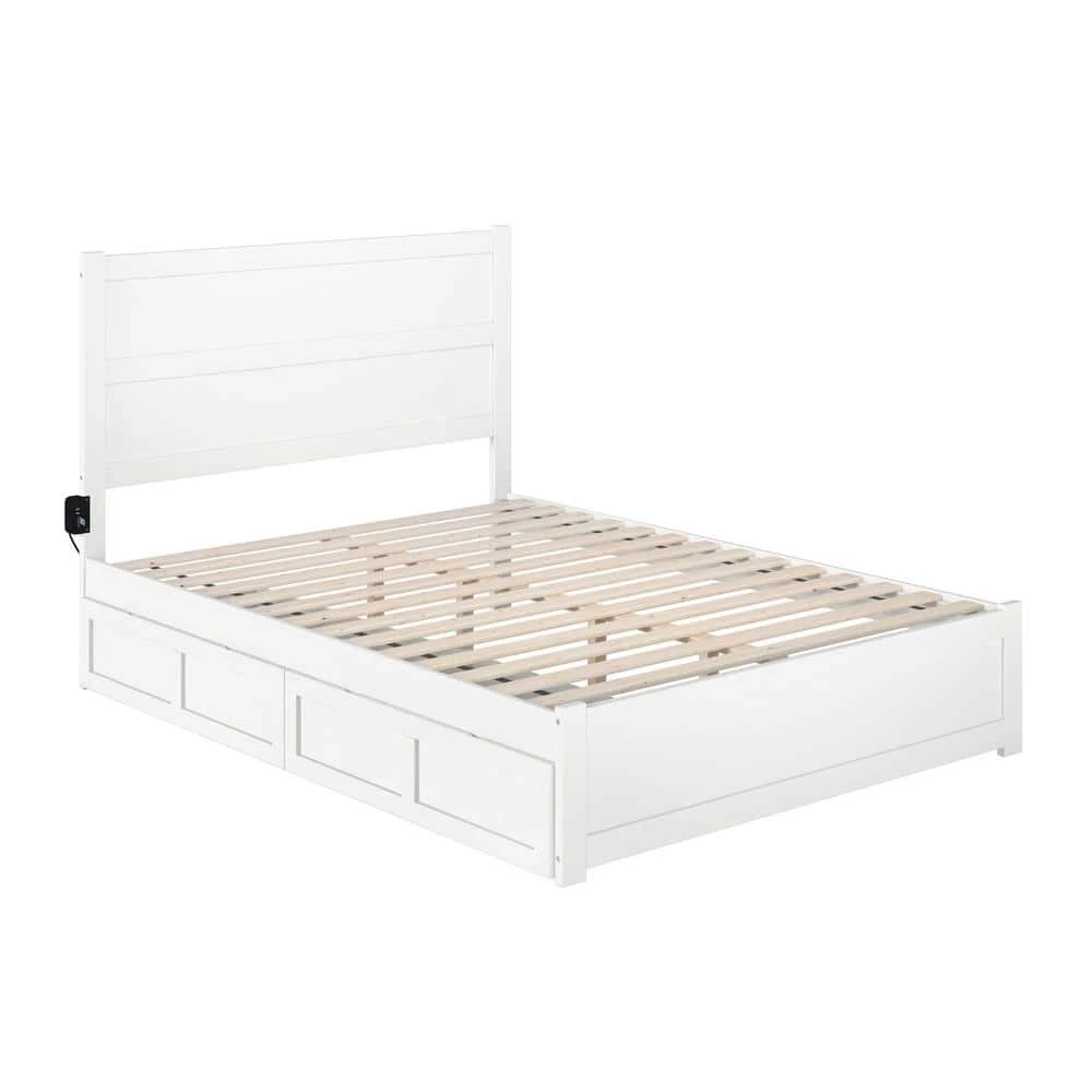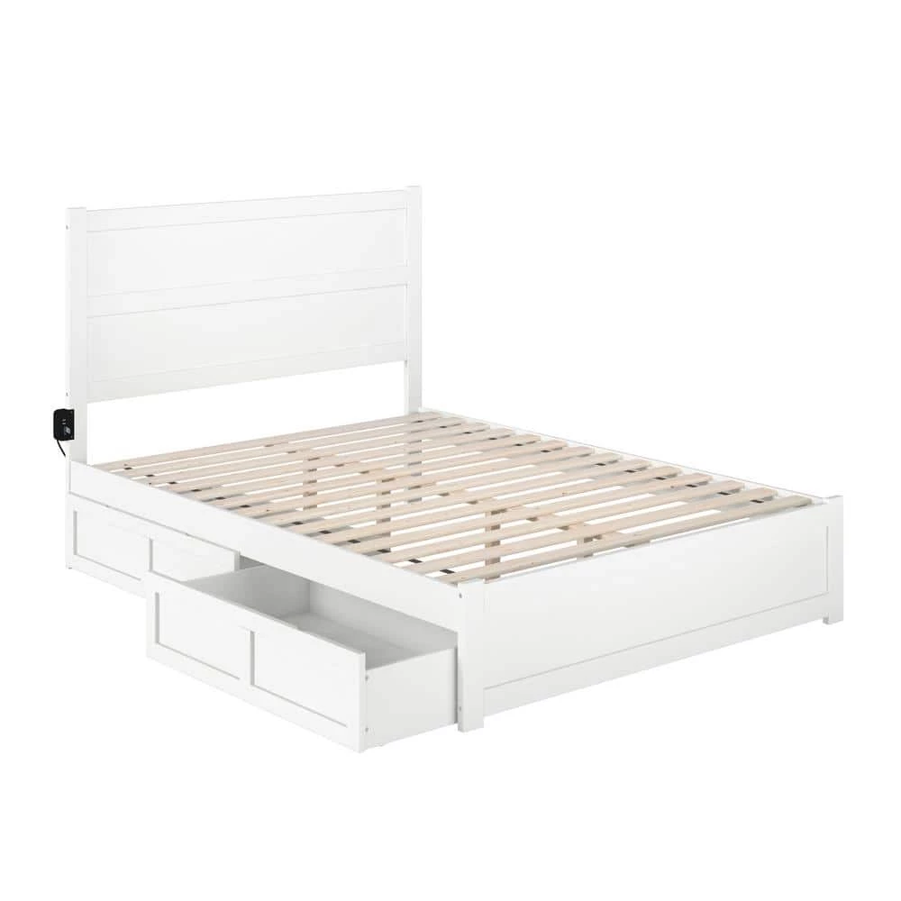Keeping your space nice and clean has never been easier with this NoHo platform bed! These beautifully added bed drawers, fit seamlessly underneath and offer the perfect amount of storage space. Functionality has never looked this good! Crafted from a mix of solid hardwood and veneers for durability, you will rest easy at night knowing you are fully supported. A strong, supportive, slat kit means there is no need for a foundation as the mattress sits perfectly on top of the slats and side rails, offering extra support and the perfect amount of airflow! Attach the included charging station to keep all your favorite devices charged and ready to go after a great night’s sleep!