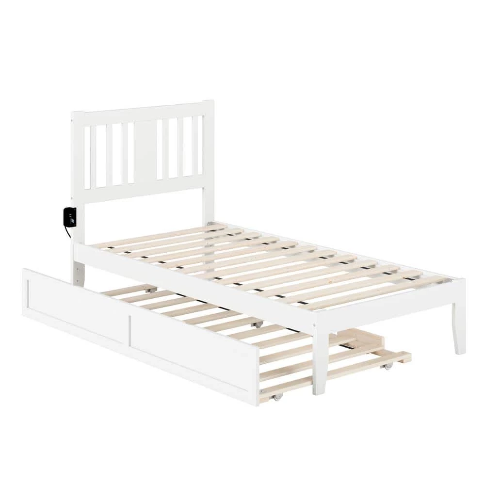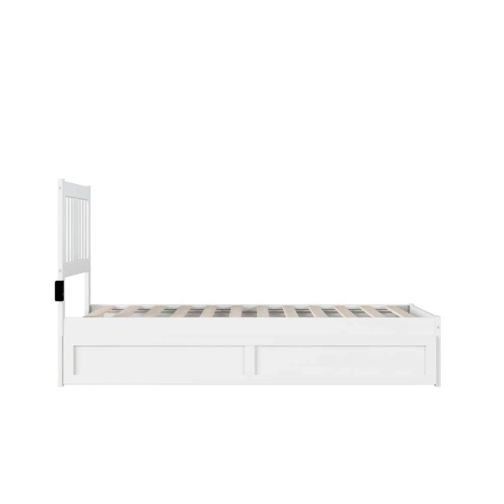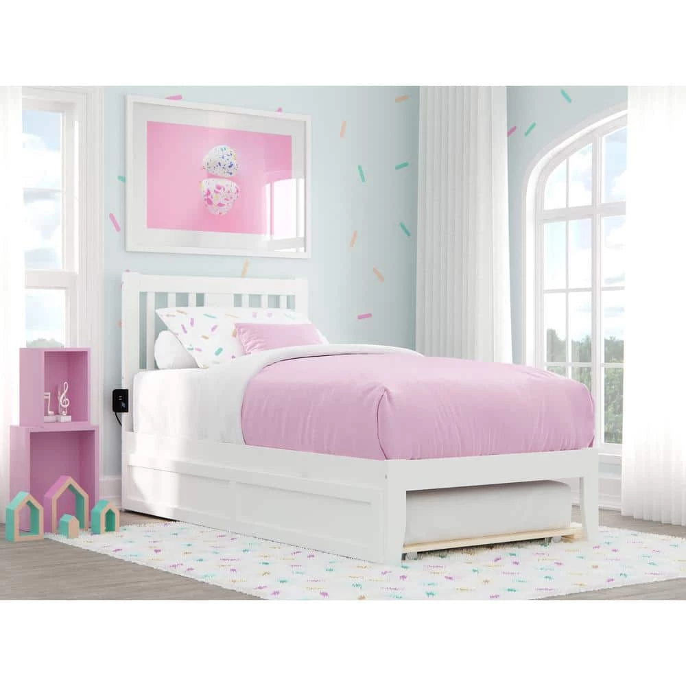 The Tahoe Bed is more than a functional sleeping space – it’s a stunning piece of decor thanks to the classic style of the headboard. Traditional mission slats meet beautifully crafted crown molding to make an eye-catching spot for an idyllic slumber. Crafted from a mix of solid hardwood and veneers for durability, this bed ships complete with a strong, supportive slat kit and does not require a foundation. The mattress sits on top of the slats and rests on the side rails, allowing for good airflow and providing great support. This design includes a convenient trundle bed and a surface mount charger to keep all your electronics charged and ready to go!