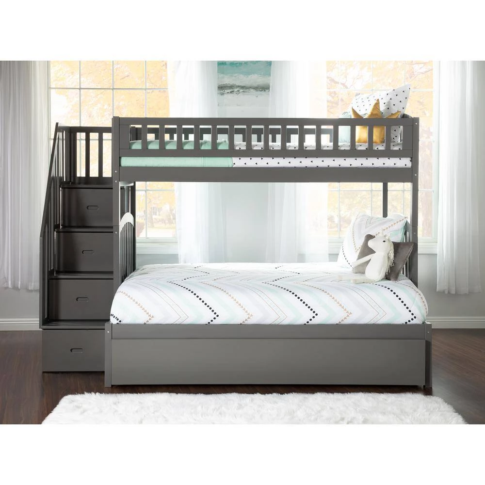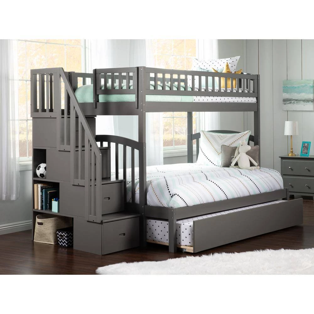 Sure to be the star of any sleepover, the Westbrook Staircase Bunk bed features a sturdy staircase to the upper bunk. Built into each step of the staircase is a spacious storage drawer running on wooden center mount drawer slides and three rectangular shelves, varying in size. This bonus storage is a must for those working with limited floor space for other furniture. The Westbrook Staircase bunk includes two slat kits that are mattress ready and eliminate the need for bunkie boards or foundations. Attach the included surface mount turbo charger and keep all your electronics charged and ready to go!