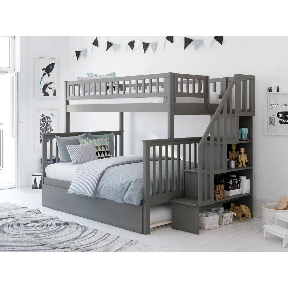 The Woodland Staircase Bunk is the ultimate storage bunk bed. Equipped with a bookcase built into the staircase, space saving organization has never been simpler. This bunk includes two slat kits that are mattress ready and eliminate the need for bunkie boards or foundations. The Woodland Staircase Bunk bed is sure to meet both your sleep and storage needs in style. Attach the included surface mount turbo charger and keep all your electronics charged and ready to go!